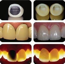 从色泽效果上:烤瓷牙大多采用传统的比色技术,牙齿颜色较容易失真、色调不一、过渡不自然、反白等假牙特征;牙冠采用德国VITA比色技术,色泽更自然、真实。